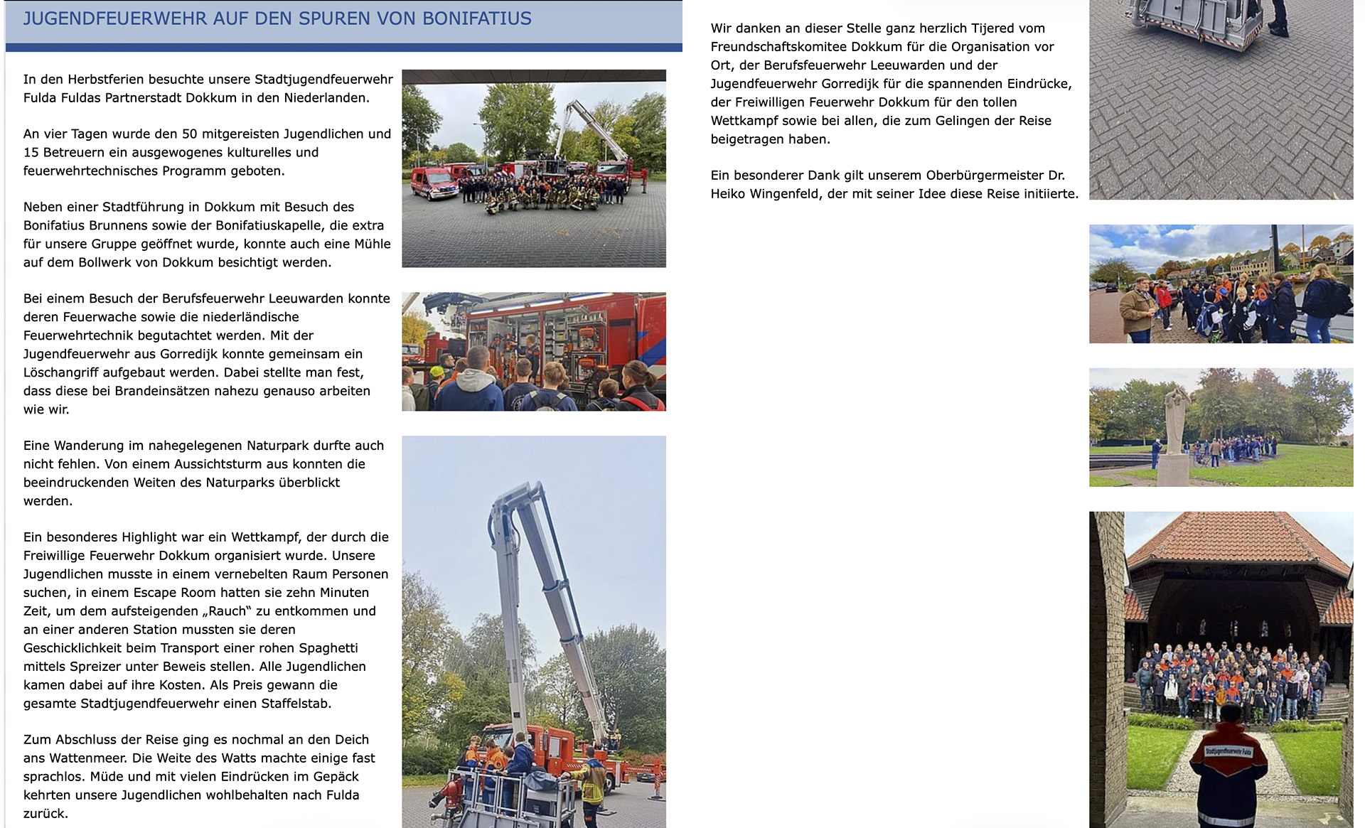 Op 11 oktober hebben we een groep van 65 personen welkom geheten op Natuurlijk Kollumeroord , waar de jeugd zich buiten lekker kon uitleven en de begeleiders even tijd hadden om het programma door te nemen. Onder leiding van Melanie Medler uit Fulda was er met de regionaal coördinator jeugdbrandweer Tjitske Visser een mooi programma opgesteld, waartussen ook nog tijd was gepland om de regio te ervaren en Dokkum te beleven. Op zondag werd de kazerne in Leeuwarden bezocht en was er daar een interessant programma opgezet. Op maandag hebben we overdag een wandeling door Dokkum gemaakt, waarbij we o.a. de Bonifatius kapel en molen Zeldenrust hebben bezocht. ’s Avonds is de groep nog ontvangen door het brandweerkorps van Dokkum, waar voor de jeugd een mini brandweerrally was georganiseerd, waar fanatiek werd gestreden om de winst, zijnde een echte mini brandweerstaaf. Na het ontbijt op dinsdag werd weer ingepakt en heeft men nog de zeedijk bij Paessens Moddergat bezocht, waar men nog even de sfeer van de Wadden kon ervaren. Moe maar voldaan door de vele indrukken die men had opgedaan, werd de terugreis naar Fulda ingezet.